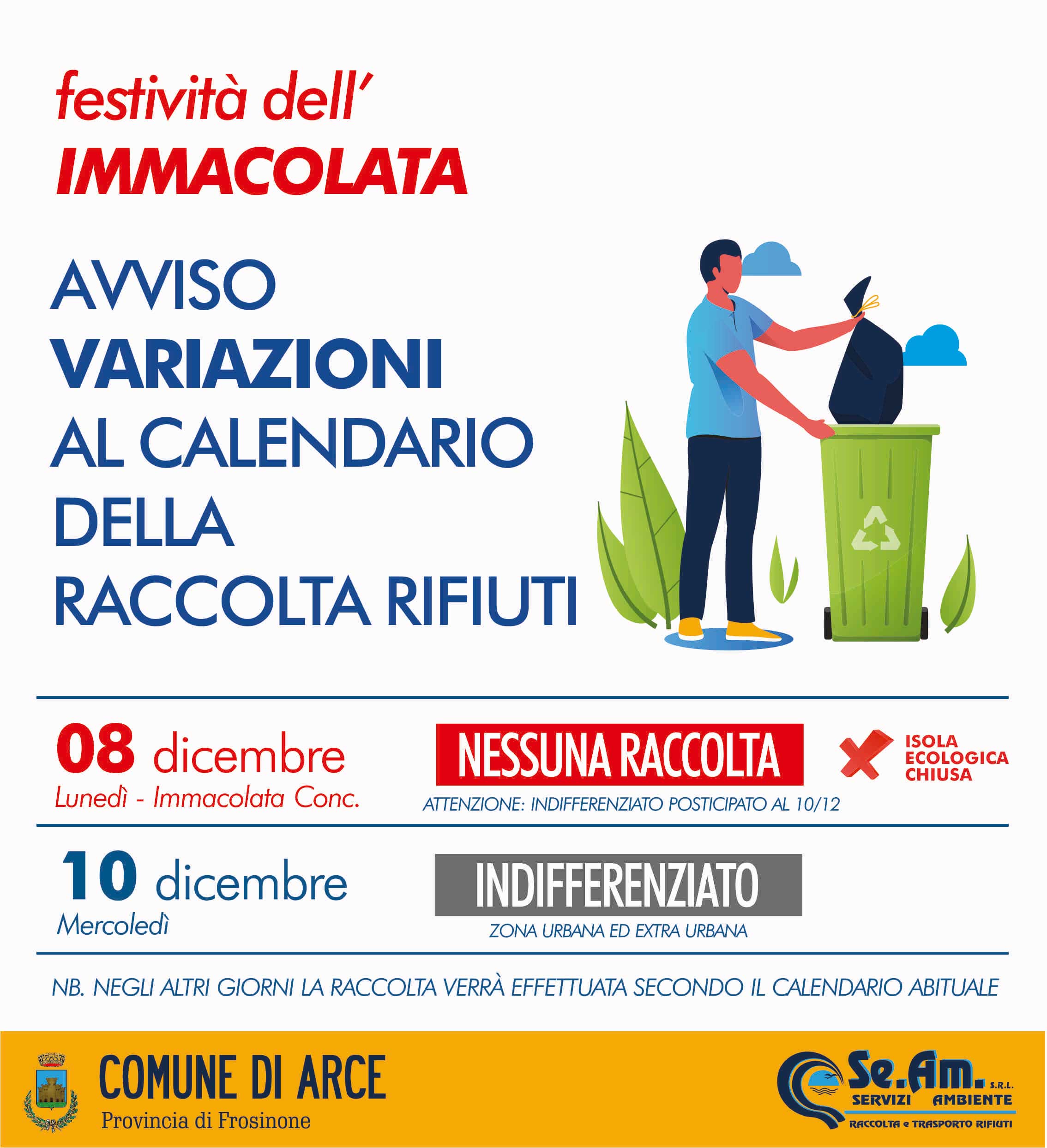 ♻️ Festività dell'Immacolata – Variazioni raccolta rifiuti
